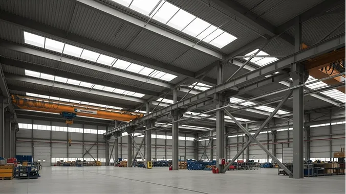 Expansão fabril com vãos livres de 25 metros e ponte rolante.