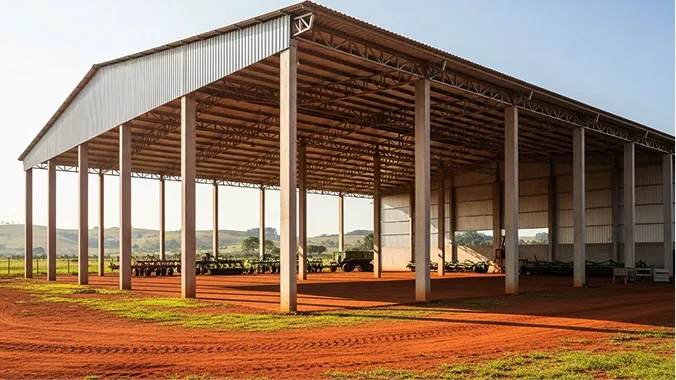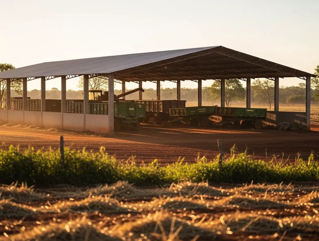 Barracão de 1.200 m² com estrutura pré-moldada e cobertura metálica.